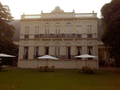 The estate maintains its original romantic garden with winding paths, a greenhouse, and stables, representing one of Rio de Janeiro's last urban country houses.
