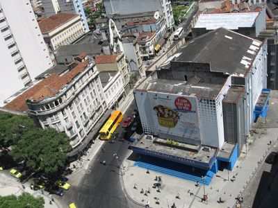 The theatre building sits between Uruguaiana and Carioca metro stations, making it easily accessible for visitors exploring Rio de Janeiro's Centro district.