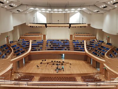 The hall features specialized acoustic chairs and variable sound elements across 32,464 square meters of performance and cultural space.