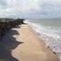 The beach stretches along the coastline with red cliffs reaching heights of fifteen meters and golden sand meeting the Atlantic Ocean waters.