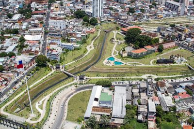 The park opened in 2009 on former stilt house settlements that impacted the Manaus and Bittencourt streams, transforming the area into public green space.