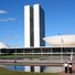 The National Congress Palace is a concrete parliament building in Brasília with two distinctive domes and two tall towers rising between them. The upward-facing dome houses the Chamber of Deputies, while the downward-facing dome contains the Senate, both connected by a low platform.