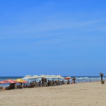 The 500-meter sandy stretch features green waters, natural pools, and a line of palm trees along the shore with beach huts and umbrellas.
