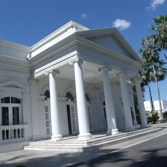 Palácio Karnak is a government building in Teresina featuring Greek Revival elements such as Ionic columns and a triangular pediment across its main facade. The structure now serves as the state government headquarters of Piauí, displaying a distinct classical architecture visible immediately upon approach.