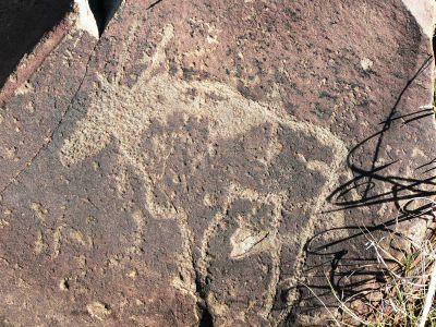 The engravings primarily depict large mammals using a pecking technique that removes the outer rock crust to reveal lighter stone beneath the surface.