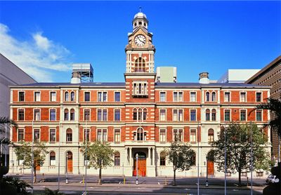 The four-story Rissik Street Post Office stands in the center of Johannesburg with its distinctive clock tower and architectural details from the 1800s.