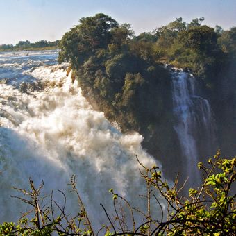 Victoria Falls National Park protects the southern bank of the Zambezi River where it plunges dramatically into a gorge. The falls span across the landscape and divide into multiple channels as they descend into the chasm below.