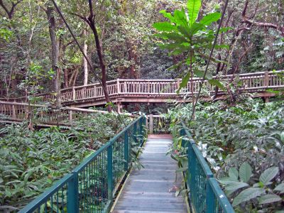 A suspended bridge crosses over the Crocodile River, offering an unexpected viewpoint of the waterfalls and rainforest below. This elevated perspective allows visitors to see the forest structure in a way that ground-level pathways cannot provide.
