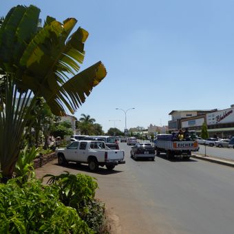 Livingstone sits on the northern bank of the Zambezi in Southern Province and ranks among Zambia's larger urban centers near the border with Zimbabwe. Wide avenues run through residential areas with gardens, markets and commercial zones, while quieter stretches along the river feature boat landings and waterfront paths.
