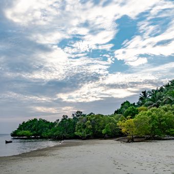 Mafia Island is an island in Pwani Region featuring mangrove swamps, coastal forests, scrubland, and grassland across its landscape. The terrain rises to a maximum of 53 meters above sea level and spans approximately 435 square kilometers.