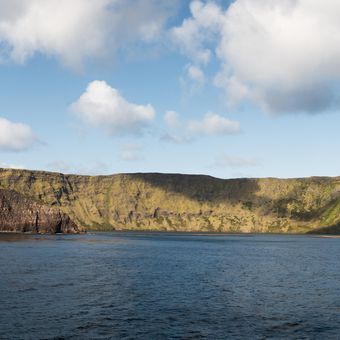 Île Saint-Paul is a volcanic island in the southern Indian Ocean covering roughly 7 square kilometers with steep cliffs along its eastern edge. An interior basin holds thermal springs, while the volcanic crater opens directly toward the ocean.