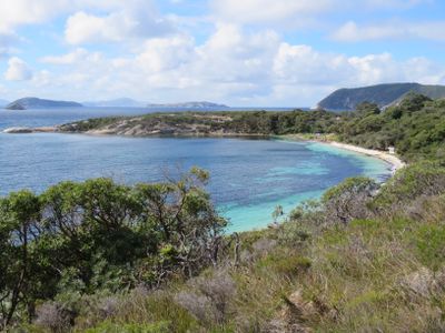 The white sand beach stretches 300 meters along the coast with granite outcrops forming the eastern boundary near Vancouver Peninsula.