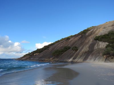 Misery Beach stretches 200 meters along King George Sound, with white sand bordered by large granite formations and clear waters.