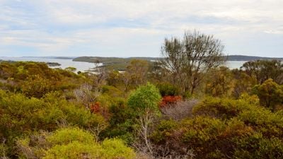 Kellidie Bay Conservation Park encompasses 17.84 square kilometers of land featuring limestone ridges, black tea tree woodlands, and coastal vegetation near Coffin Bay.
