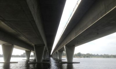 The Windan Bridge extends 403 meters across the Swan River, featuring two prestressed concrete box girders supported by two rows of piers along its span.