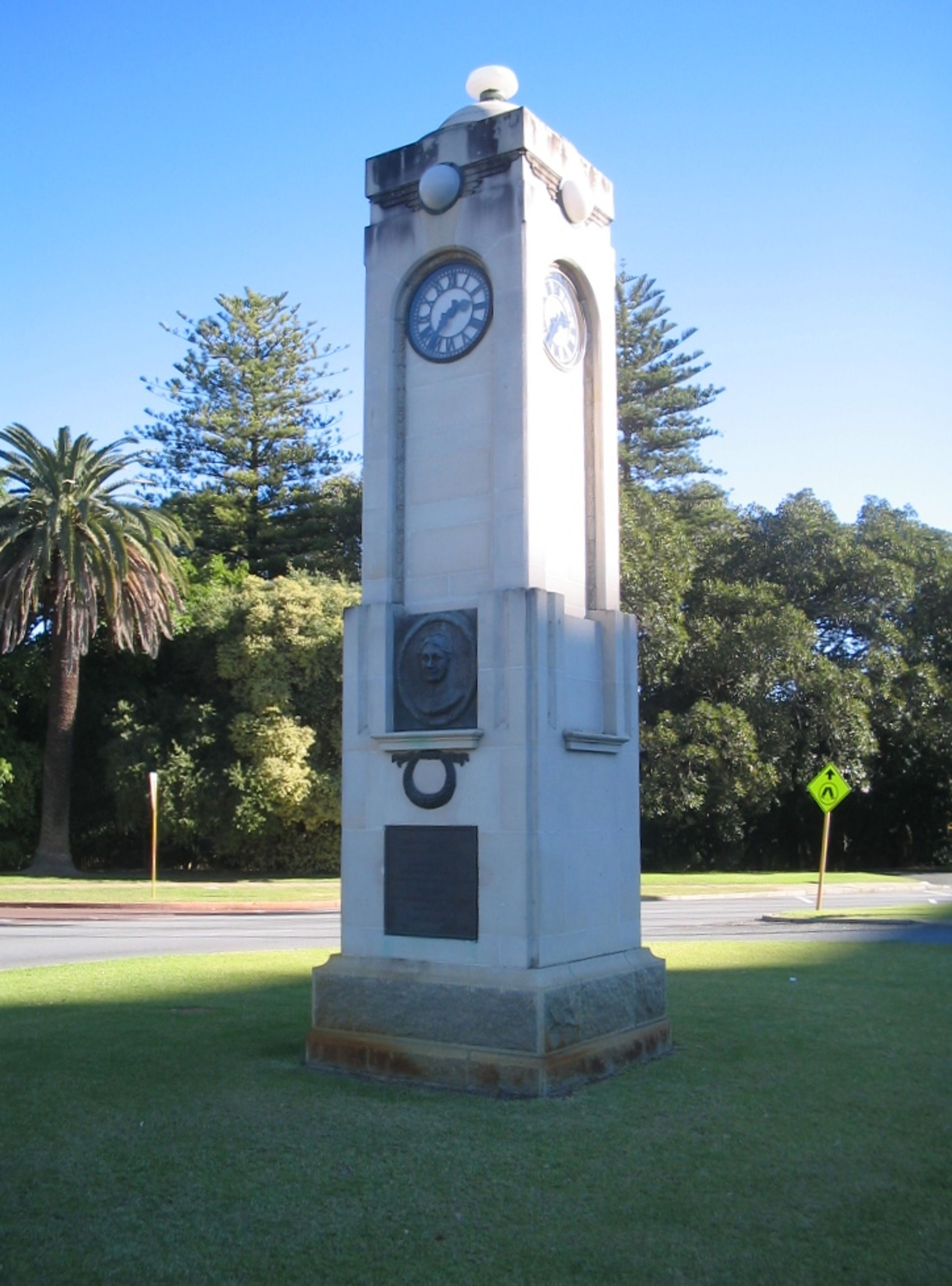The memorial clock tower serves as a navigation point at the intersection between Fraser Avenue and Kings Park Road in Perth.