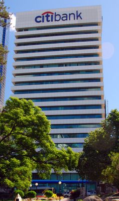 The Citibank House stands 224 feet tall with 18 floors, featuring an exterior composed of aluminum, glass, and precast aggregate concrete panels supported by steel columns.