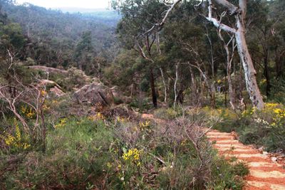 Kalamunda National Park contains extensive woodlands of jarrah, marri, wandoo, and butter gum trees along the meandering Piesse Brook waterway.