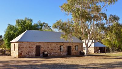 The limestone buildings of the Telegraph Station form a complex with a main office, residences, and maintenance structures near a natural water source.
