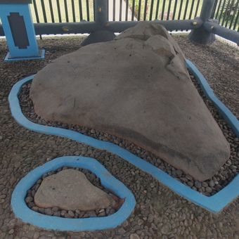 The Jambu Inscription sits in Batu Tulis on a natural rock face measuring between 2 and 3 meters (6.5 to 10 feet) on each side. Two lines of text are engraved into the surface, with two footprints carved into the stone above them.