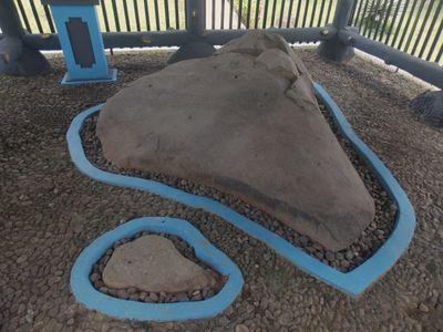 Two footprints were carved into the stone above the text, though the left one has partially worn away due to natural rock fractures. The prints were meant to symbolize royal presence and remain visible today, even as the stone has cracked in several places.