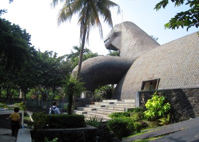 The museum building features a distinctive shape of an enormous Komodo dragon structure housing exhibits of Indonesian reptiles and amphibians across multiple floors.