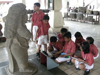 The Trowulan Museum preserves objects from an ancient settlement now hidden beneath farmland in East Java. Inside are stone carvings, pottery, and other finds that archaeologists have unearthed from the surrounding area.