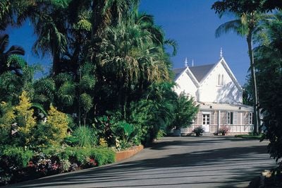 The house features mid-Victorian Gothic architectural elements with surrounding verandahs and porches spanning 13,000 square meters of hillside gardens in central Darwin.