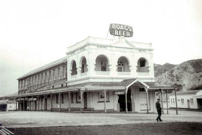 The Empire Hotel stands at the intersection of Orr and Driffield Streets, featuring a prominent two-story facade across from the Queenstown railway station.
