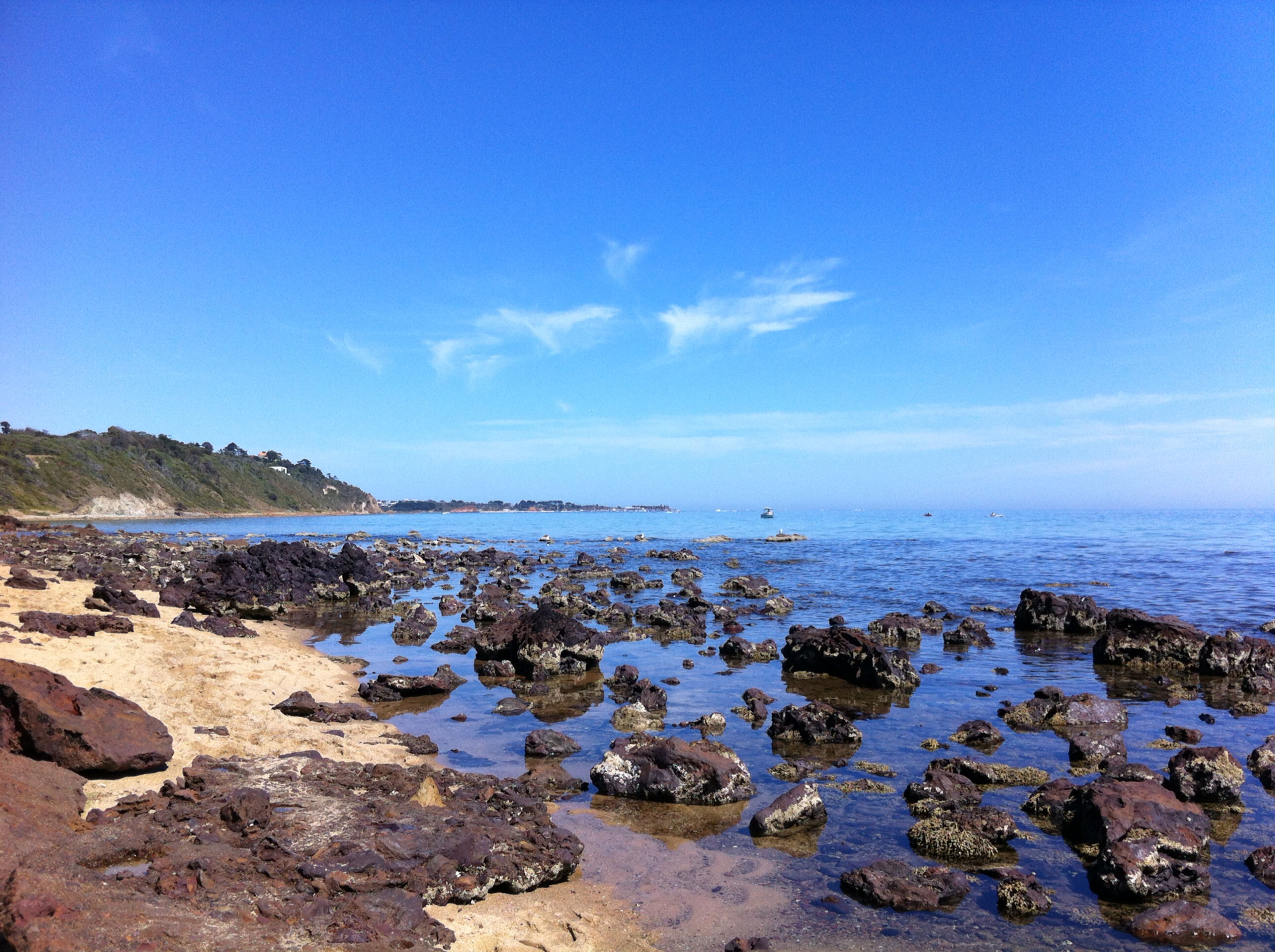 The beach stretches along Port Philip Bay with a sandy shore bordered by rocks, providing views across the calm waters toward Melbourne.
