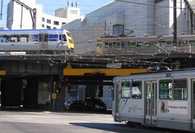 The Flinders Street Viaduct spans 760 meters with four railway lines connecting Flinders Street Station to Southern Cross Station in central Melbourne.