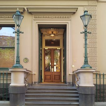 The Melbourne Club occupies a heritage-listed building featuring traditional decor, meeting spaces, dining areas, and bars for its select members.