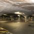 The underground parking facility features curved concrete shells with parabolic profiles supported by columns that incorporate drainage pipes for lawn irrigation.