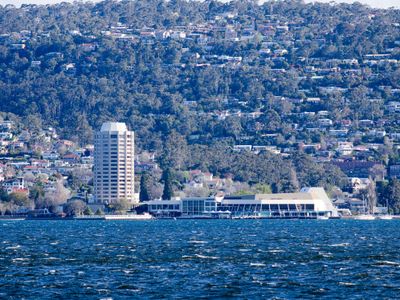 The Wrest Point Hotel Casino rises 73 meters above the Derwent River, featuring 17 floors of accommodation, gaming areas, and dining establishments.