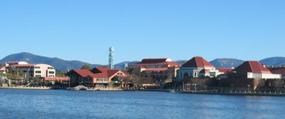 Tuggeranong Town Centre spreads along the southwestern edge of Lake Tuggeranong with multiple-story shopping complexes and various retail stores. The area includes supermarkets, dining venues, service providers, and is anchored by South Point Tuggeranong as its main commercial hub.