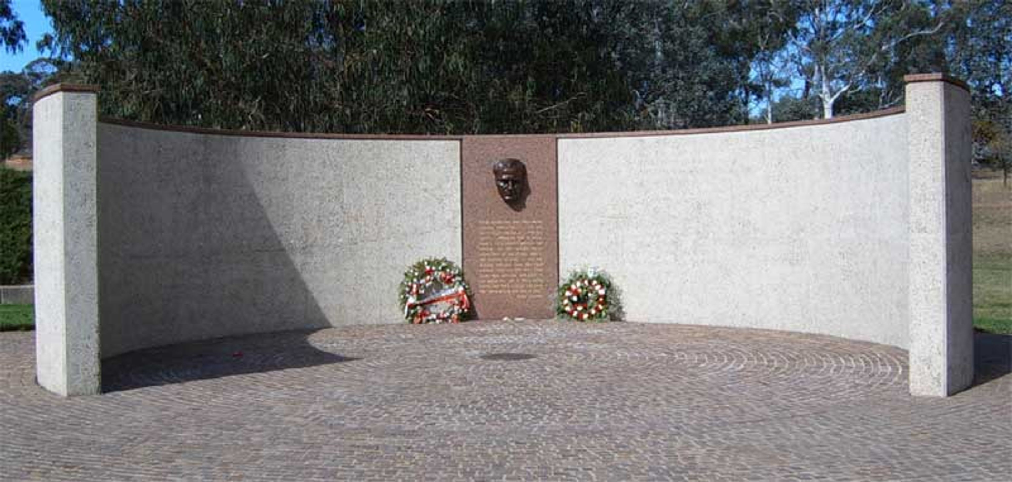 The memorial features a crescent-shaped wall with a bronze likeness of Atatürk on a circular paved area facing the Australian War Memorial.