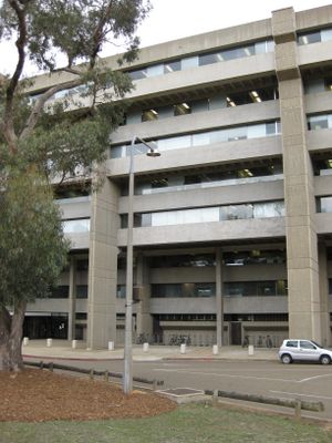 The structure represents 1970s Brutalist architecture in Canberra, recognized by the Concrete Institute of Australia with their Principal Award for Excellence in 1975.