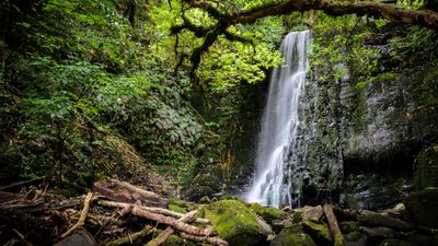 Matai Falls, 97-meter waterfall in Catlins Forest Park, New Zealand.