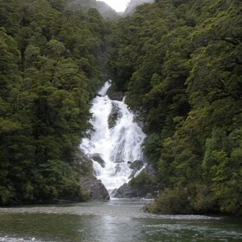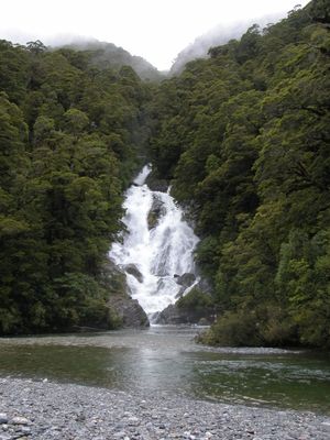 The 23-meter Fantail Falls cascades down the rock face, spreading into a fan pattern before entering the clear waters of the Haast River.