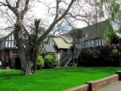 The Dux de Lux stands as a Tudor Revival style building constructed from double brick with timber-framed roofs, featuring stained glass windows, slate tile roofing, and decorative rimu wood panels throughout its interconnected wings.