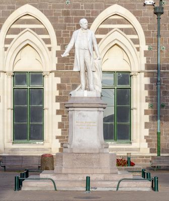 The life-sized marble figure of William Rolleston stands on a stone plinth along Rolleston Avenue, facing the Canterbury Museum entrance.