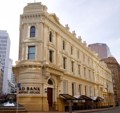 Four separate Bank of New Zealand buildings compose the current Old Bank Arcade, forming a coherent architectural ensemble in downtown Wellington.