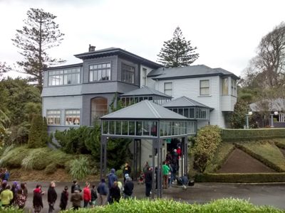 The official residence on Tinakori Road is a two-story timber house with bay windows and a conservatory at the rear. The white Italianate building contains eight bedrooms and sits on a property that extends up a gentle slope in Thorndon.