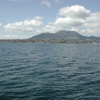 Taupō Volcano is a dormant volcano beneath Lake Taupō on New Zealand's North Island, with a wide caldera formed by past eruptions. The calm water over the crater conceals fumaroles and hot springs on the lakebed that signal ongoing geothermal activity.