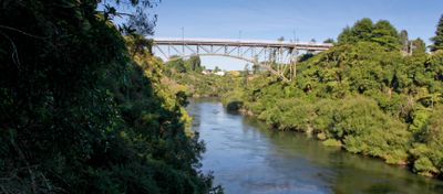 The Victoria Bridge spans the Waikato River with a three-pinned steel arch design, reaching 38.4 meters above the water level and extending 88.4 meters across.