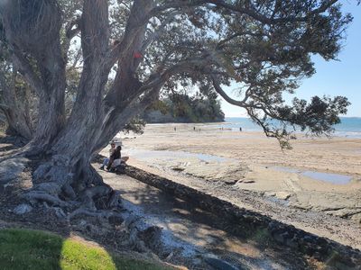 The sandy stretch extends along the Tamaki Strait, offering views of Waiheke Island, Motukaraka Island, and the surrounding waters of Hauraki Gulf.