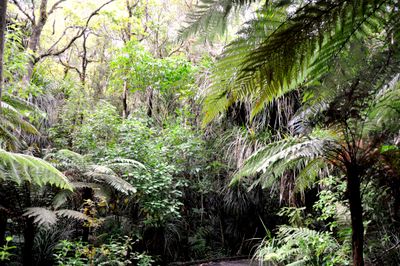 Waipoua Forest is a protected woodland covering 1,500 hectares where massive kauri trees grow among ferns and dense vegetation. The forest contains multiple walking trails that wind through ancient groves, revealing the different layers and inhabitants of this ecosystem.