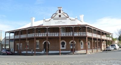 The Grand Western Lodge is a two-story building in Millthorpe featuring a decorative cast iron verandah on its front facade. The structure showcases distinctive keyhole-shaped windows and a prominent stuccoed central parapet typical of early 1900s design.