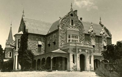 The granite structure features sandstone dressings, curvilinear parapeted gables, and iron finials across its extensive 50-acre grounds near Ophir Road.