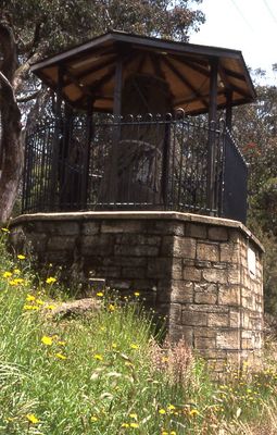 The Explorers Tree stands as a concrete stump on a stone podium beside the Great Western Highway at the base of Pulpit Hill.